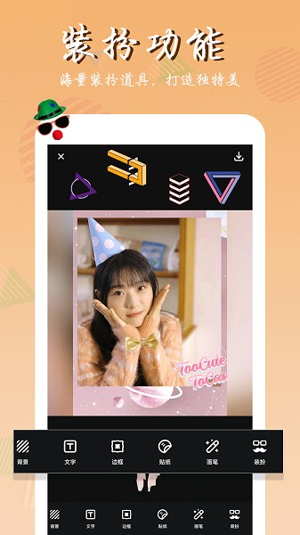 3、丰富的装饰元素,包括文字模板、贴纸库、边框样式、动态特效等,让你的照片不仅清晰美观,还富有创意和趣味性。