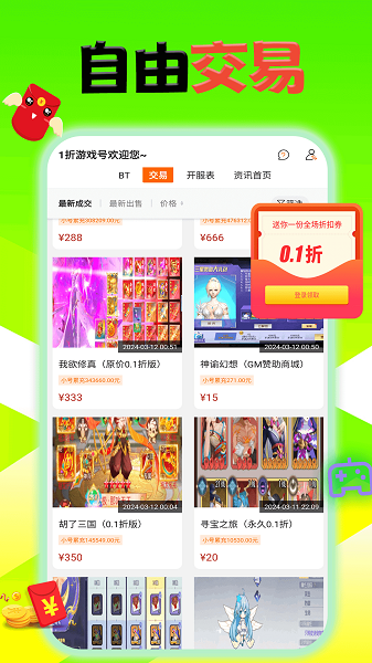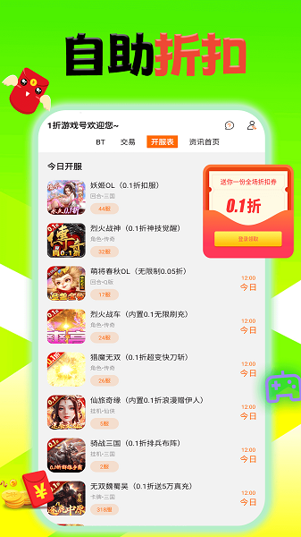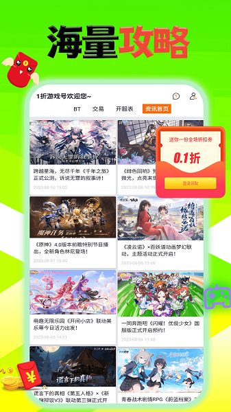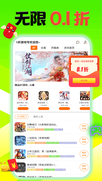1折游戏号app在这里带来了非常丰富的游戏资源,众多折扣手游这里都可以查看详情的,想怎么下载游玩都行的。平台上可以免费领取超多的福利礼包,每次充值也是非常省钱的,让大家签到也可以奖励奖励的,非常方便。