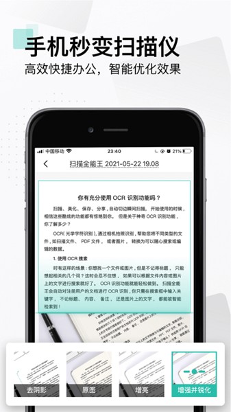 手机拍纸质文档,智能去除杂乱背景,生成高清JPEG、PDF文件。默认自动扫描,对准纸质文档自动拍照,解放双手。