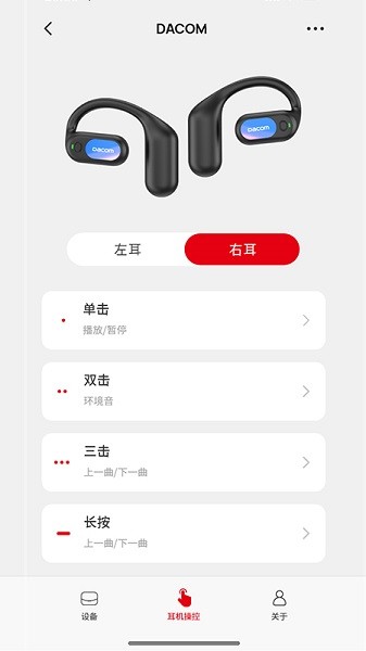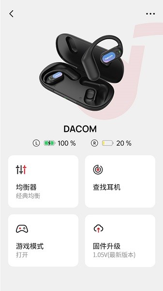 DACOM手机客户端可以让大家快速绑定各种蓝牙耳机,想怎么在手机上控制蓝牙耳机都行的,能够自由设置音量大小,还可以设置触控按钮的功能,日常升级蓝牙耳机的固件也行的,让大家使用蓝牙耳机都很轻松的。