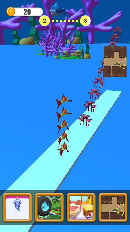 3.全新的跑酷玩法需要你控制,小鱼不断的奔跑,收集更多的小鱼,让仍不断变大