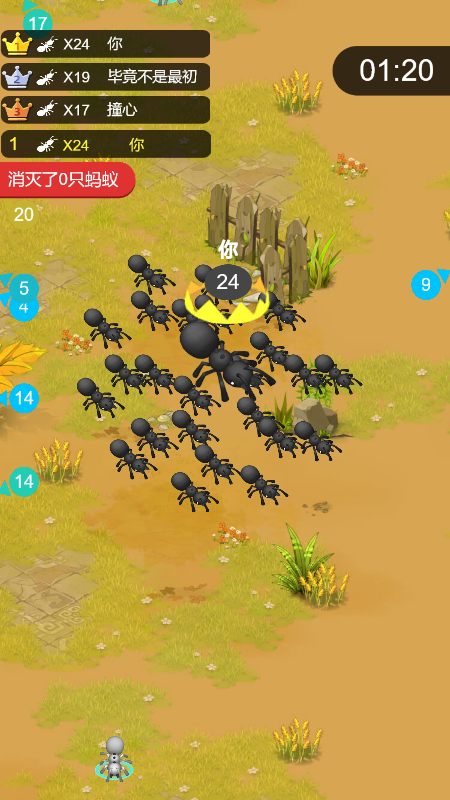 1.在游戏中,必须不断收集你的小弟,这样才能释放出更多的蚂蚁人群来达到目的
