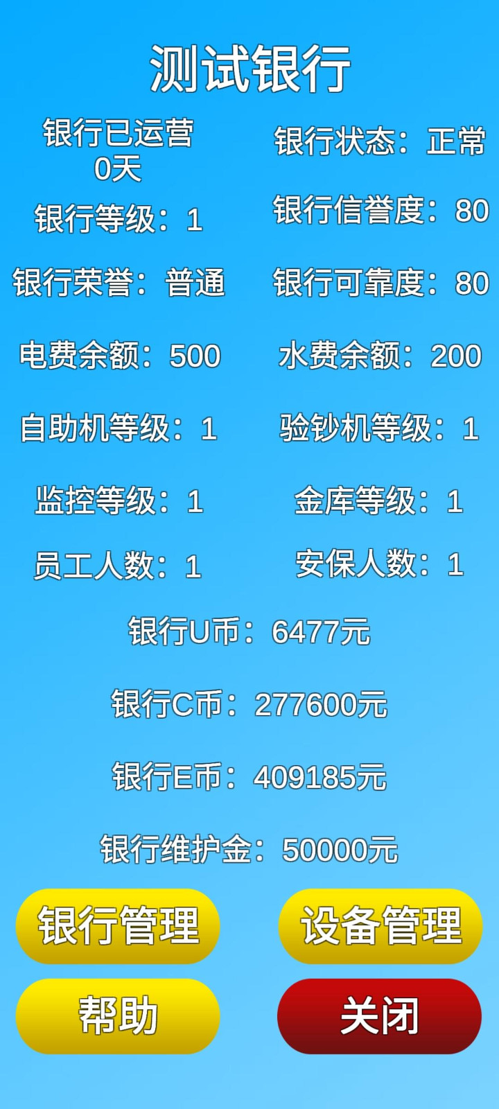 银行人生是一款好玩的模拟经营游戏,游戏采用文字的方式进行推进,在这里你将扮演着银行的行长,你将完成一系列的银行管理工作,银行人生游戏中你将在这里通过一步步的奋斗,慢慢的晋升,这里你要升级银行的系统,招募更多的员工进行工作,还需要为这个银行的安全请来几个强壮的安保。