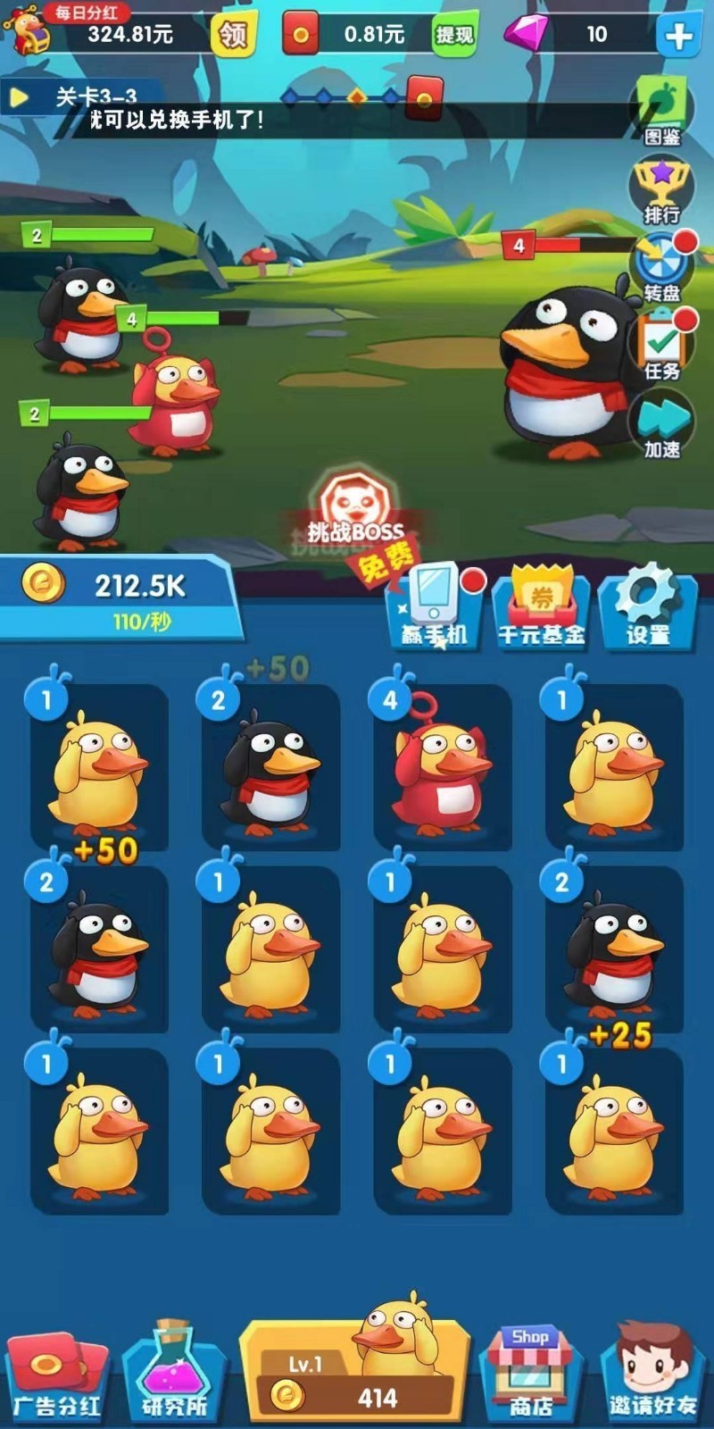 新推出的不断合体鸭子来获得红包的游戏。在疯狂飞度鸭红包版游戏中,我们可以养殖多种小鸭。我们可以合成和升级鸭子。鸭子等级越高,你得到的现金红包就越多。感兴趣的朋友应该下载疯狂飞度鸭红包版并开始使用!