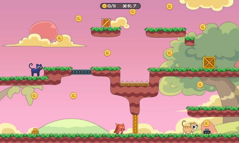 游戏玩法非常新颖,采用了双人冒险的玩法,一胖一瘦两只猫需要互相配合才能完美的通过关卡。猫咪的形象设计也十分的可爱,跳跃、冲刺等动作也很流畅。