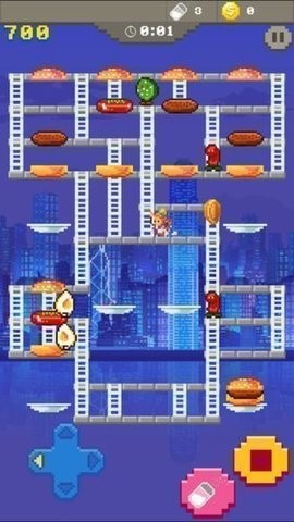 1.控制小人上下左右拿汉堡的食材。玩家将扮演厨师的角色,超多的汉堡等待你的制作。当然会有很多障碍阻挡你。