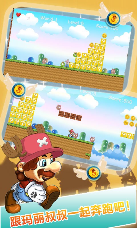 奔跑吧马里奥中文版加入了最新设计的游戏模式,游戏的各方面也进行了优化。奔跑吧马里奥中文版游戏中玩家要不同的关卡里面不断的奔跑,避开你前方的怪物,不要被撞到,也不会面临失败。当然,关卡中怪物的数量是不一样的,所以要小心。