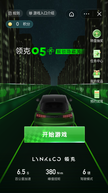 解锁领克05小程序是一款新型的创意赛车冒险闯关小游戏,解锁领克05小程序游戏能够让大家感受到更加高端的驾驶体验感,豪华的领克05轿车出现在游戏画面中,大家能够自由的选择去体验,能够不断的提升自己的驾驶技术,可以感受到赛车的无限乐趣
