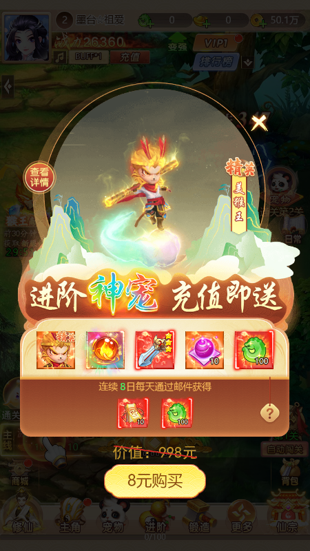 2.各种不同的副本不断的刷怪,获得更多的武器装备帮助大圣完成闯关