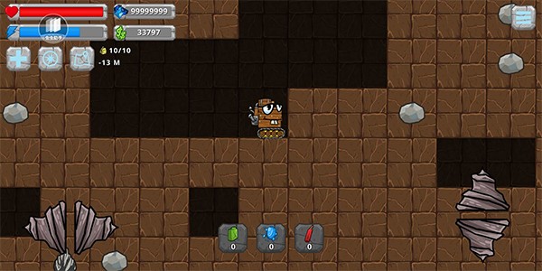 1、总体来说,游戏的玩法还是比较实在的,通过向左、向右和向下挖掘,向上可进行火箭上升,期间这些操作都需要挖掘机耗能。游戏以探索地底世界,获取贩卖地底的稀有资源为目标,由此往复来改装升级你的挖掘机。