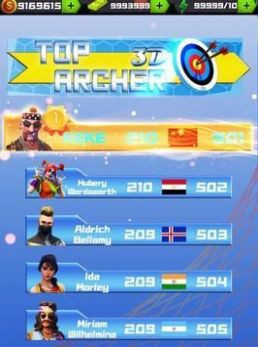 顶级弓箭手是一款以弓箭为主题的射击休闲游戏。游戏中并没有将射击战斗作为游戏方式,而是有不同的玩家在一起进行箭术比拼,在相同的距离下,谁射中的环数是最多的呢?快来试试吧。