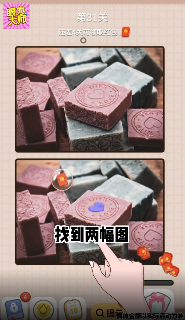 眼力大师红包版是一款考验眼力的益智闯关手机游戏。玩家需要在眼力大师红包版中根据关卡要求快速的寻找到对应的物品,在关卡中找到你需要根据要求找到不同的物品,在规定时间,找到物品最多的玩家获得游戏胜利。感兴趣的千万不要错过!