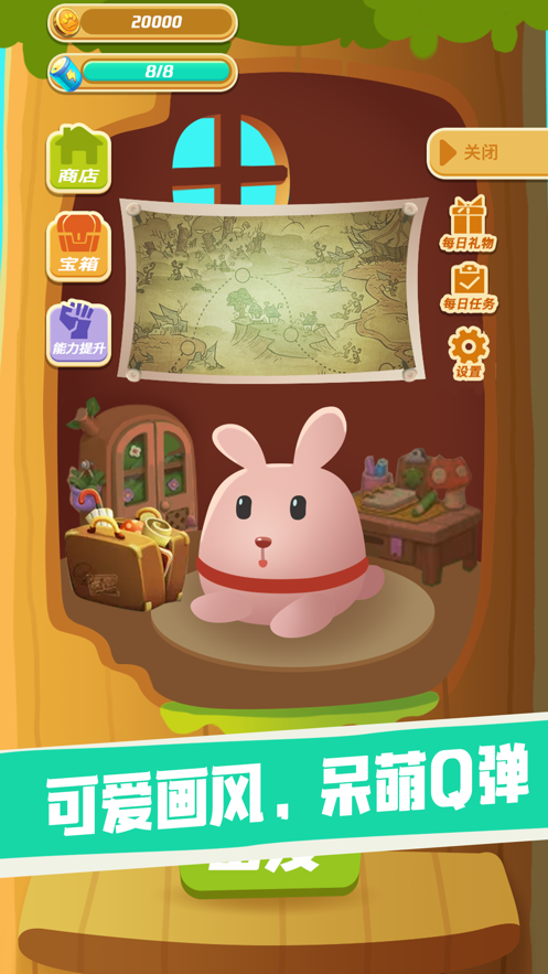 1、每次简单的跳跃来冒险,玩家操控呆萌的小兔子,一起跳跃闯关吧;
