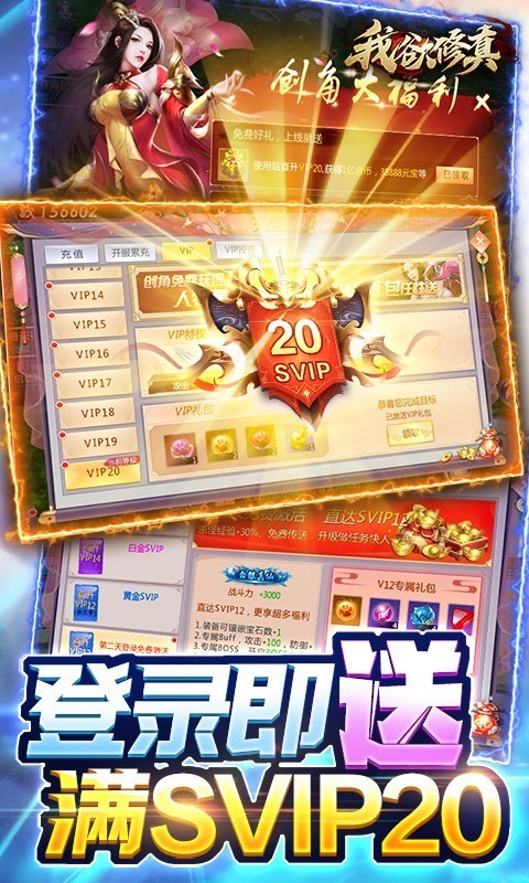 2、上线满V、1亿金币、38888元宝、海量大礼包