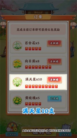 玩家开局可以得到一片田地,自由的种植花园,收货不同的红包,在自己愉快的人生中挑战,每秒钟都可以得到奖励、直接兑换出红包吧,极速自由的完成订单任务,登录游戏后按照系统的操作得到0.3元,也可以观看视频来得到元宝,完成4级订单得到两个红包,红包也能兑换元宝喔。