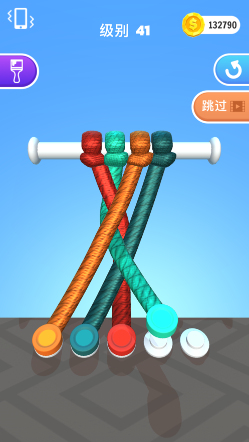 主要是考验了玩家的耐力、眼力,在时间有限的关卡中体验,一根一根的顺利解决缠绕在一起的绳子,慢慢抽丝剥茧、找到缠绕的根源、所有颜色的绳子都要对应解开。
