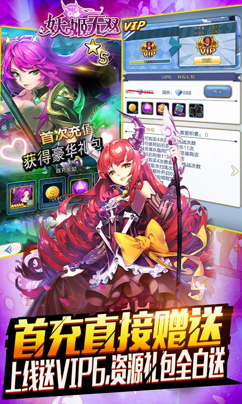 妖姬无双BT福利版是一款二次元竖版挂机手游。玩家上线就送VIP6、钻石*28888、金币*50W;新增免费充值系统,在线即可点充值。充值比例1:1000 首次充值1:2000,VIP礼包近乎白送,超多资源不砍礼包。通过签到送顶级5X自选卡,海量的资源等你来拿,直接让你爽到飞起。