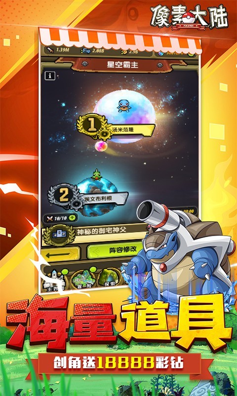 像素大陆是一款以口袋妖怪为原型的回合制手游。玩家登录即送18888彩钻,白嫖抽精灵up池,让你赢在起跑线。签到送50连抽(秘术召唤·十重*5)、首充月卡免费领、不肝不氪拼战术。在这里所有宠物均可白嫖获得,你需要控制你的宠物来完成不同的挑战,快来开启你的冒险之旅吧!