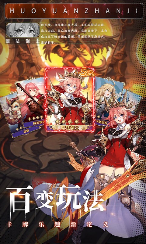 火源战纪可盘版是一款非常好玩的卡牌回合制手机游戏。首发期间将开放免费获取288连抽、九名S级英雄、SS千岚+限定稀有皮肤等福利活动,游戏中时不时会出现【神秘代码】及各种福利活动福利多多,不容错过!你将在游戏中控制你的角色来完成不同的挑战,感兴趣的快来下载挑战吧!