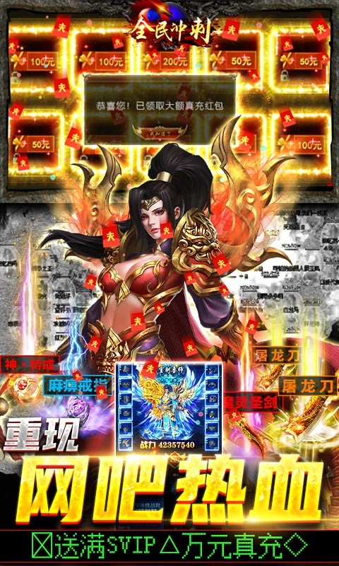全民冲刺官方版是一款大型多人在线的RPG传奇游戏。玩家开局直接满V完成目标送万元真充;通过每日签到就赠送大量充值红包,充值比例1:5000,首充3倍,特殊档位更有5倍返利。通过缉杀即领红包,进服送灵宠;不断游玩全民冲刺官方版来体验最好玩的CQ游戏!