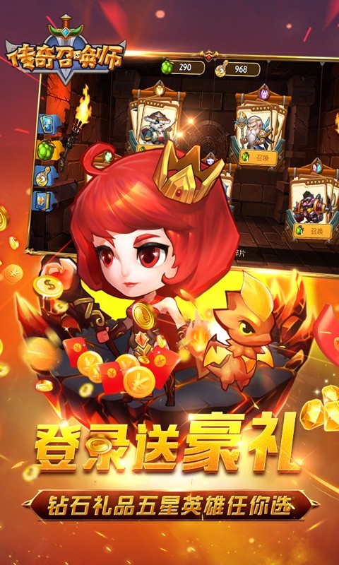 传奇召唤师官方版是一款趣味性十足的卡牌对战手游。玩家建立角色就送VIP8、钻石*38888、金币*100w、启示之石*100、奇异精华*2000、铭文*2000、白银钥匙*100。每日登陆送10连抽抽奖道具卷,乐趣十足。在冒险的过程中,你将化身为召唤师来完成各种挑战,不断游玩传奇召唤师官方版来体验最好玩的卡牌游戏。