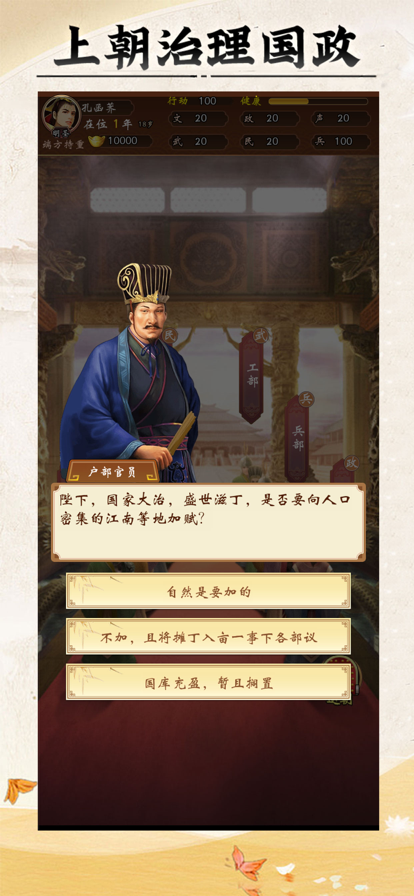 皇帝人生,一款人气不错的趣味模拟类型游戏。皇帝人生游戏中玩家将接管整个国家,坐上皇帝的位置,这里还有大量的游戏其他玩法和模式可以开启的,而且游戏中还有不同的故事可以摸索哦,独特的剧情,多样的选择,开放式结局。