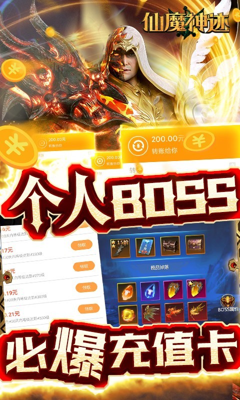 仙魔神迹红包版是一款年度现金红包版手机游戏。玩家创角送现金红包,支持现金真实提现,让你轻松赚取零花钱;登录再送千元充值卡、VIP16、1亿金币!月签到送7000元现金卡+每两天寻宝必出200现金卡,每月福利过万!每日打怪集字兑换GM币,GM商城物品随你挑!海量的福利等你来领取。