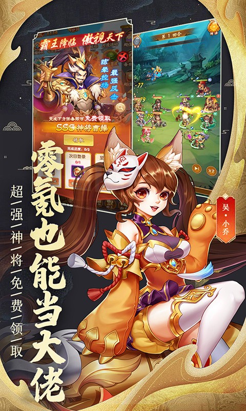 挂挂三国是一款以三国为背景的东方武侠题材RPG游戏。玩家上线就送五星武将关羽、万元大礼包。每日签到领豪礼,累计七日登录奖励享不停。开局直升VIP10、千元充值卡、百连抽,让你直接爽翻天。任意首充就送美人貂蝉,超强神将免费领取,让你零氪也能当大佬。感兴趣的快来下载挑战吧!
