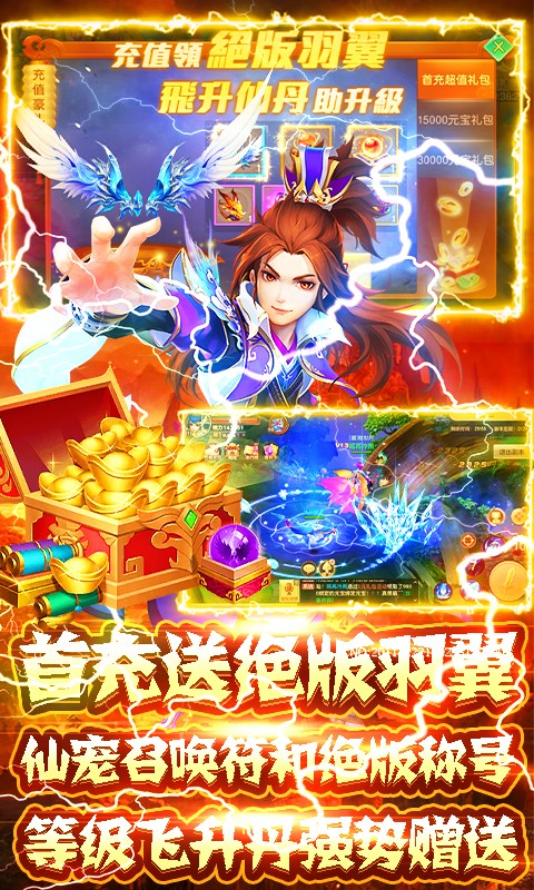 5.首充即送绝版羽翼,仙宠召唤符,绝版称号【铃儿响叮当】,更有等级飞升丹强势赠送,祝您等级飙升,纵横六界,同时双倍首充返利,3个档位任你选择~