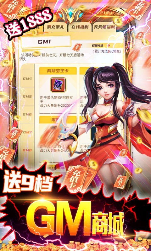 2.上线送1888元充值,使用获得同等价值元宝,1:500充值比例,更有百万元宝免费领,海量元宝花不完。