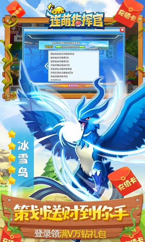 1.上线即送VIP15,128888 钻石,2000万金币,58888精灵币。