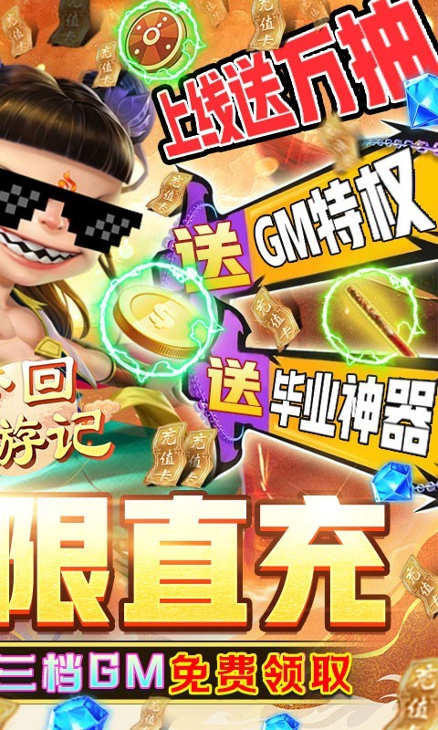 3.上线就送18888元宝,GM大圣,388W铜钱等你拿!充值比例1:500!更有多倍返利拿到手软!