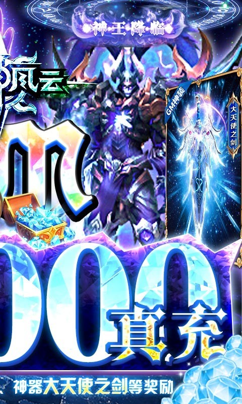 1、创角即送VIP10(首日完成任务送满V)、【神器】大天使之剑、超强金龙宝箱、真充碎片礼盒(可获得各种真充卡碎片)和万元充值卡礼盒。