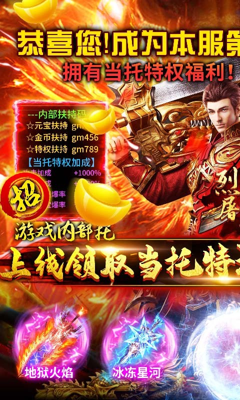 烈焰屠神特权版是一款原汁原味的传奇手机游戏。创角即可激活当托特权,每日领取托号奖励。开局就送VIP15、百万元宝、金币*10亿,无限福利领不停。激爽体验1秒百级,千万战力开局,暴虐一切BOSS。你将在游戏中控制你的角色来完成不同的挑战,感兴趣的快来下载挑战吧!