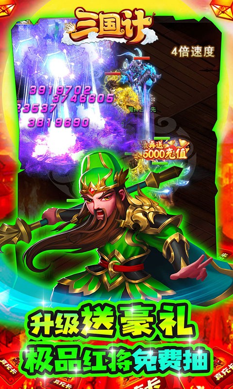 三国计绿色福利版是一款正版授权的回合制手游。玩家上线登录就送10000真充,首日升级免费送SVIP特权福利。开局免费送VIP12至尊特权,连续登陆免费直升VIP25。更有炫酷神兵、极品坐骑、精美时装、限定称号等你来拿。喜欢的快来下载吧!