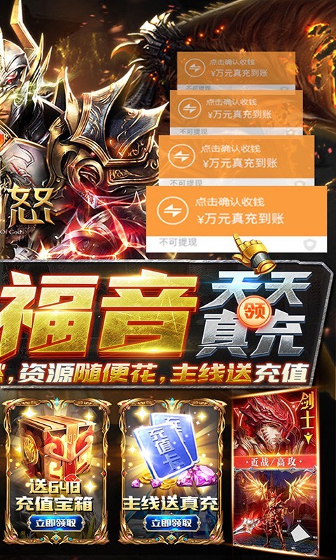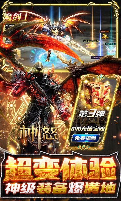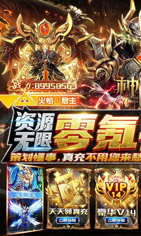 神怒是一款大型魔幻题材的国战策略类手游。玩家创角就送材料大礼包、新手成长大礼包、绝版称号、绑钻*58888、金币*888W。上线直接送V14,升级送价值648元充值宝箱,在线、主线任务领真充。充值到对应的档位,可获得高强战力、进阶资源。
