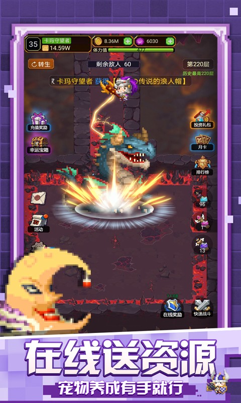 砖石精灵满V特权版是一款像素风格的战斗冒险类手机游戏。玩家创角送满V特权卡、水晶*18888,金币*100W,开局跑图加速200%、全天自动挑BOSS、灵力、金币获取量+10%。登录必送5000元水晶卡、传说宠物、装备,升级必送海量水晶,在线送升级药水,加快升级的速度。