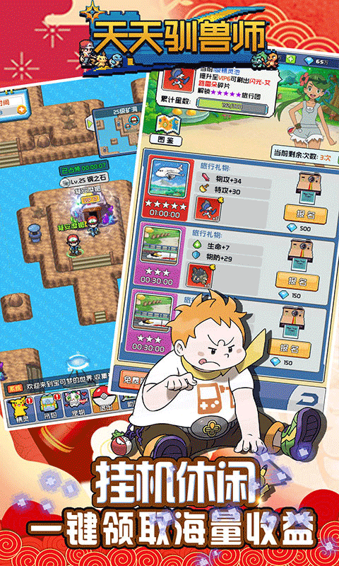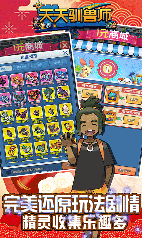 天天驯兽师BT版是一款像素风格的冒险类游戏。玩家上线赠送满V、钻石*10w、金币*1000W。新增1元商城,所有道具仅需1块钱,拥有一元精灵、碎片、道具、时装盲盒。超值VIP礼包只需1钻石购买,绝版时装、大量材料全部白拿。 首充赠送霏欧纳、终生卡三神兽3选1等。
