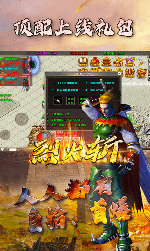 2、上线礼包送自动拾取、首爆资格,寒冰套装、爆率地图,无敌福利,拒绝付费陷阱