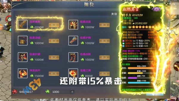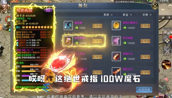 进服第三天就可以在拍卖行中看一看,绝世的戒指需要100W的魔石,绝世之刃攻击240还有基础额外攻击力3507、附加99点火伤害,只需要300W魔石,血燃真言攻击力737-1668,战龙战甲需要1500W魔石,飞天连斩要1000W魔石、所有职业通用,快来进入地图得魔石吧。