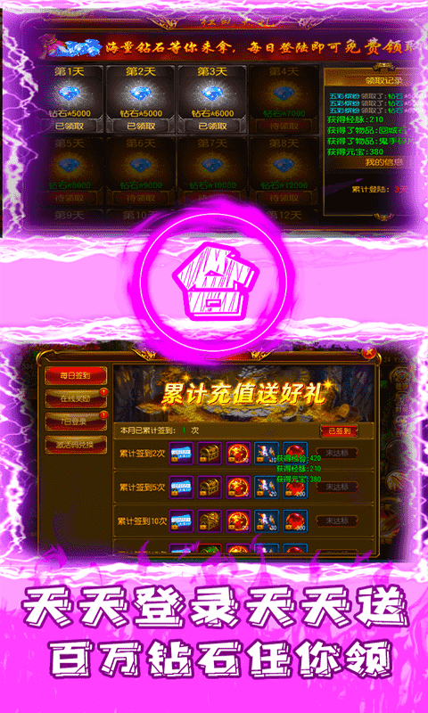 单日累计充值2000元返利:超级转生丹*3、神兵碎片*800、灵兽丹*300
