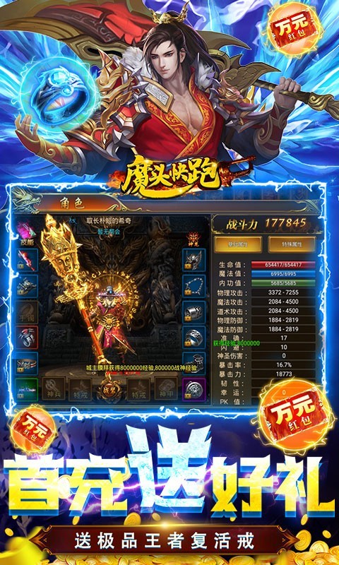 魔头快跑是一款非常好玩的传奇类游戏。玩家上线即送满级VIP、绑元*288888、冬天的十根金条*1、新手神器*1、随机时装*1。每日在线即可抽取万元红包,红包领到爽翻天。首充即送极品王者复活戒指以及海量稀有道具。