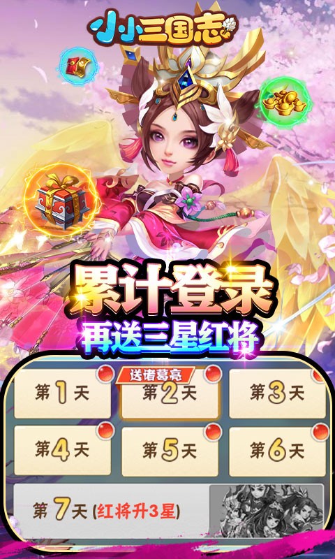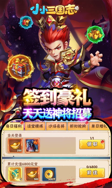 小小三国志安卓版是一款关于三国题材的卡牌策略类手游。玩家上线就送VIP15特权、1.88万元宝、500万铜币。输入礼包码就送常胜赵云激活卡*1、断愁套装*1、2.88万元宝、688万金币。连续登录送红将诸葛亮、神将刘备、红将直升3星,首充再送红将关羽、等级直升丹等豪华礼包!