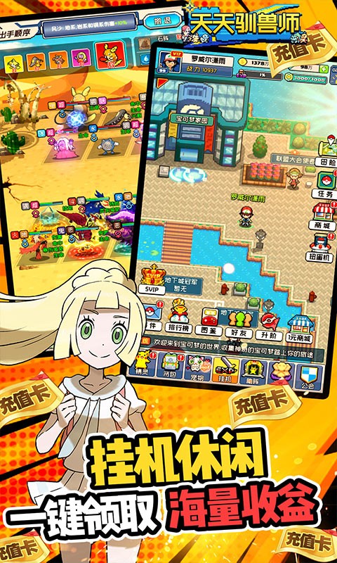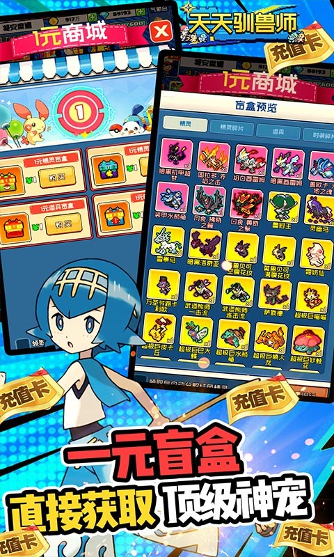 天天驯兽师首发版是一款Q版画风的回合制手游。玩家上线赠送满V、钻石*10w、金币*1000W。新增SVIP商场和1元商城,超多材料惊喜折扣价,商城内所有道具仅需1块钱。首充赠送三神狗3选1、终生卡极巨化御三家3选1、成长基金送10倍返利钻石。