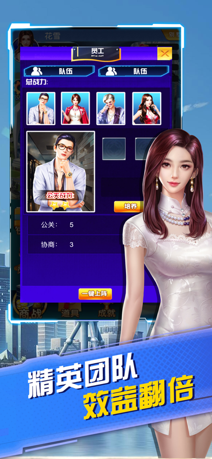 非常好玩的模拟商业运作的手机游戏,高度还原了现代都市中的画面。不仅人物画的很鲜艳,场景也很生动,真正给广大玩家带来了最好的视觉印象。全新的贴片游戏,玩家不需要有高超的拔尖操作,用自己的聪明才智在商场如战场中获得巨大的口碑!