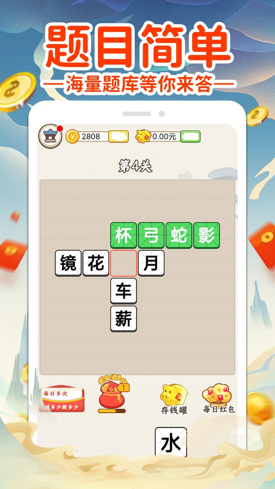 盲人猜成语是一款精品制作的休闲答题闯关手游,盲人猜成语游戏巨大的问题库正在等待你回答并赢得很多奖励。在接下来的关卡中,关卡的难度并不低,所以你可以顺利通过大关卡。这里有很多成语级别,你可以很容易地在网上猜到成语来获得奖励。这里有很多成语,很多人对他们的成语很有信心。如果你愿意,就别走开。各种玩法的难度会随着水平的加深而加深。