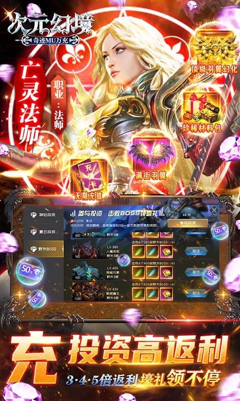次元幻境万充版是一款超多福利的魔幻RPG手游。玩家上线就送万元充值、VIP8、高级坐骑外观、珍稀材料礼包。累计活跃再送万元充值,七天登陆再送千元充值卡。福利多多,精彩多多。
