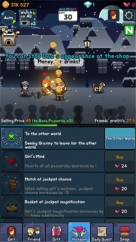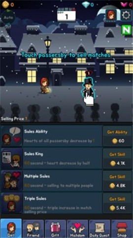 把玩家带进一个悲伤的世界,凄惨的小女孩,独自坐在黑暗的马路边,卖完火柴是自己最大的动力,在这里玩家可以通过各种技能去帮助小女孩卖掉火柴,同时自己获得奖励,去扩展自己的新技能,每个游戏场景都有不同的精彩刺激内容,每次的交易成功都让玩家有一种自豪的满足感,喜欢挑战的小伙伴们赶快来免费下载吧。