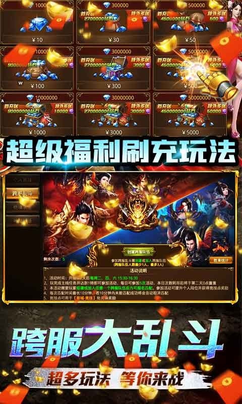 荣耀霸业刷充版是一款正版授权的传奇类手游。玩家上线即送VIP10、时装、刷充功能,让你爽到爆。7天签到每日可领取1000真充,连续登录送绝版称号等各种好礼。首日在线可以领取10000真充,送回收特权、绝版神装。