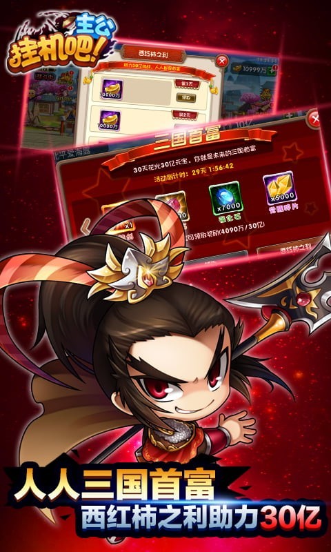 挂机吧主公西红柿首富是一款趣味性十足的三国卡牌类游戏。全新的福利版本中,特设三国首富的玩法,全民挑战30天花光30亿元宝,赢得神器大礼包。激活【西红柿之利】,每天可领1亿元宝,助力成为首富。开服签到送三国主公、超强猛将、3亿元宝,让你直接起飞。感兴趣的快来下载吧!